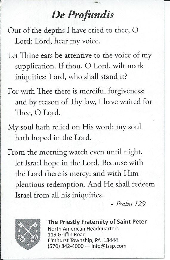 catholic holycards De profundis On March 2, 2016 | By aklusman | No comments A card from the Priestly Fraternity of St. Peter, with the De Profundis on the back. A great Psalm, one of the Seven Penitential Psalms. We ought to pray it more often for the souls in Purgatory.