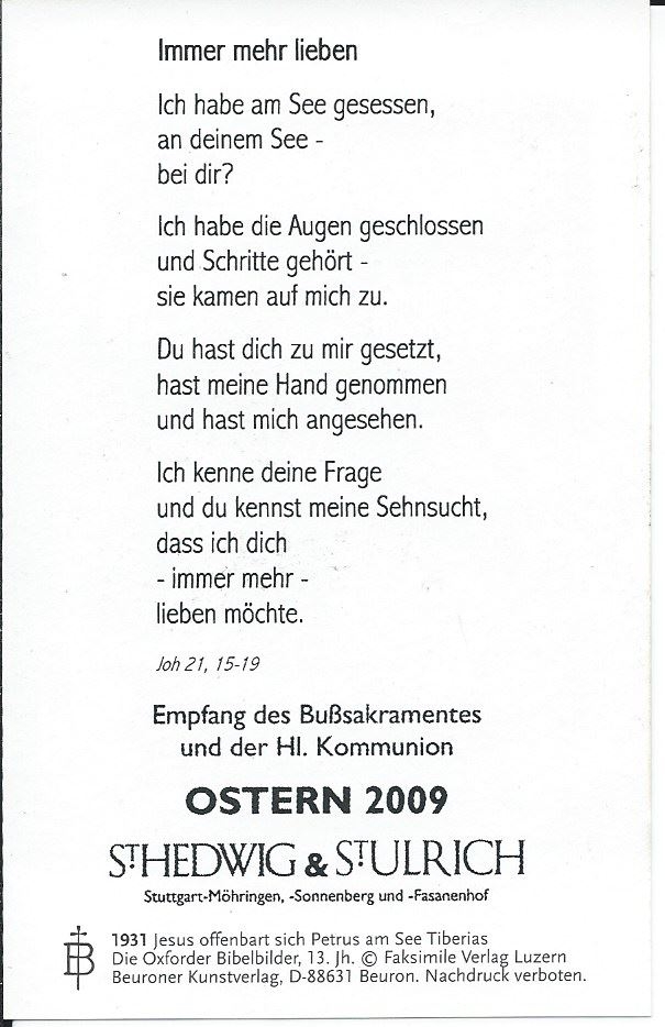 The bottom card is a commemoration of receiving Communion in the Easter season. These Easter duty cards are passed out to those receiving Communion in the Easter season (as it is a duty of each Catholic to receive Communion at least once a year in the Easter season) in at least Stuttgart, Germany. I also acquired a number of cards from the early 1900s which will probably be featured later this year. I think these are a nice tradition. Hopefully I’ll be able to find more information on them!
