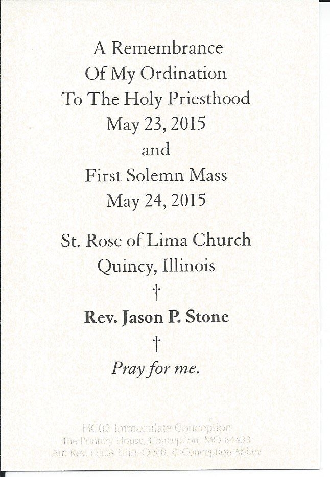 Following in the trend of my previous holy card postings, here’s a much more recent one. Fr. Stone is a recently ordained priest for the Diocese of Springfield, IL. He spent a summer at St. Martin of Tours in Louisville, KY (2014) and helped as deacon in the Solemn High Mass Juventutem Louisville put on for the Fr. Zuhlsdorf conference. He offered a Solemn High Mass at St. Martin of Tours as a Mass of Thanksgiving, and I was able to pick up a card for his ordination.