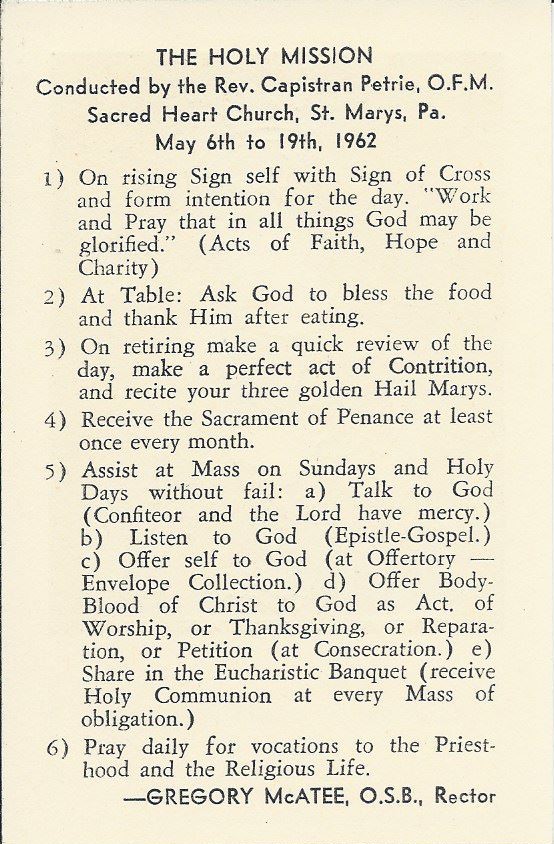Picked this up in a book that I got off eBay. It is from the time when parish missions were a bit more popular than they are nowadays. I attended a parish mission a year or two ago, and it wasn’t quite my cup of tea (nor was it really aimed at “me” per se, but seemed rather at re-Catholicizing lukewarm/uneducated Catholics).