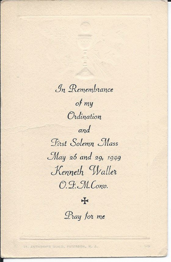 This card is a remembrance of Fr. Kenneth Waller’s, OFM Conv ordination to the priesthood and the celebration of his first Solemn Mass on May 26 and 29, 1949. Fr. Waller was ordained at the Cathedral in Toledo, OH. You can read a short biography on him and his life here.