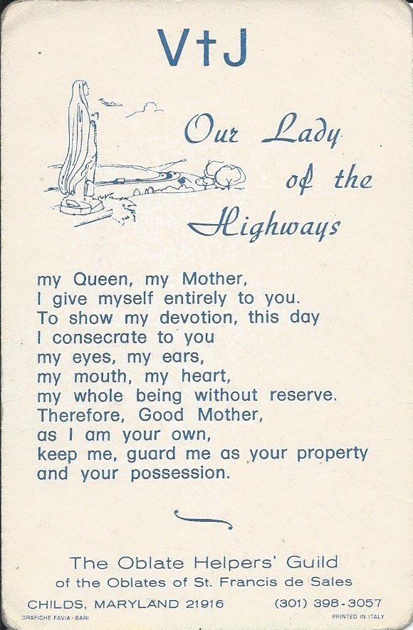 One of the (many) things I love about Catholicism is how we try to Catholicize… pretty much everything we do (or at least, we used to). From institutions like St. Mary-of-the-Woods (see what I did there?) to Our Lady of Pretty-Much-Anything-Ever, we have Our Lady of the Highways. This devotion has a varied history, and it seems different parts of the country have their own shrines. The one this card came from is located in Childs, Maryland, which has its beginnings in a tragic automobile accident that occurred in October 1968. There is also a shrine in New Jersey dedicated to Our Lady of the Highways, which, as expected, also stemmed from a tragic automobile accident.