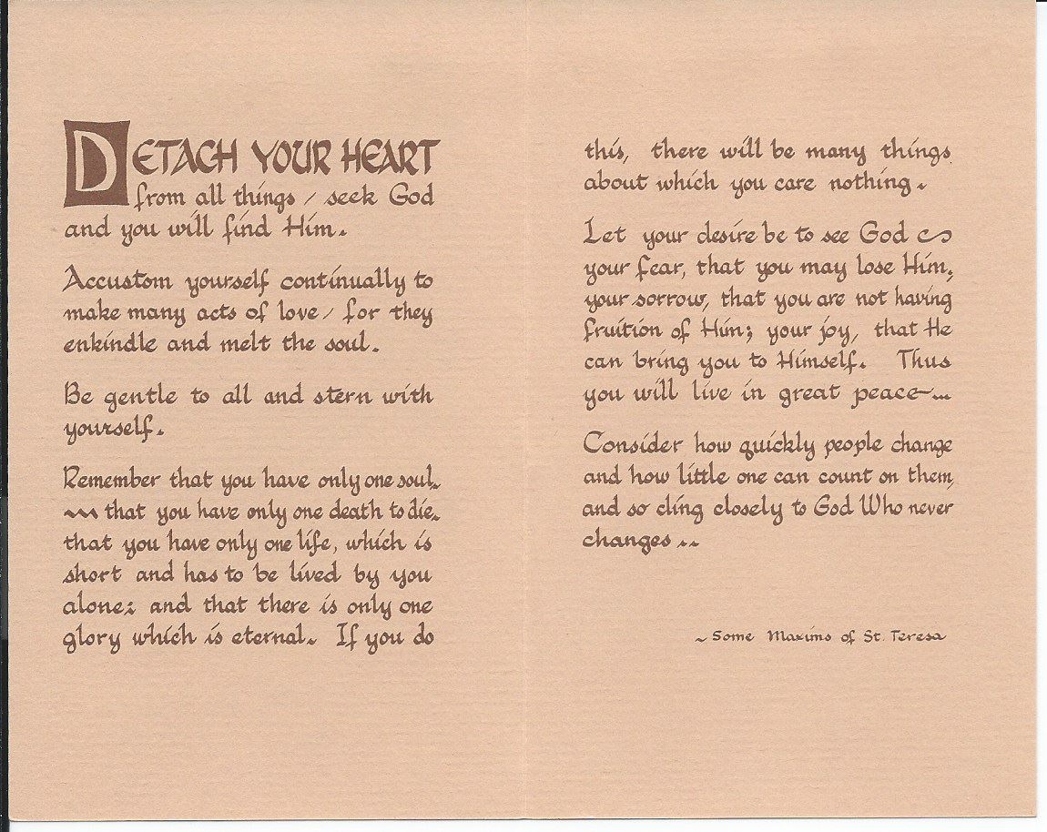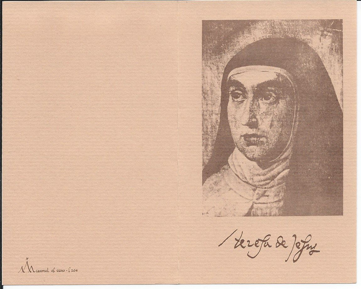 That famous Carmelite mystic, St. Teresa of Avila. This card folds in half (as can be seen by the fold mark!) and has some maxims from St. Teresa inside. The card comes from the Carmel of Reno, although their website (and chapel) seem to leave a lot to be desired.