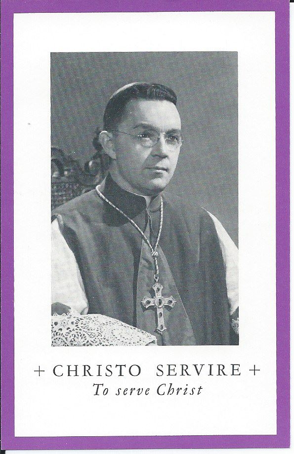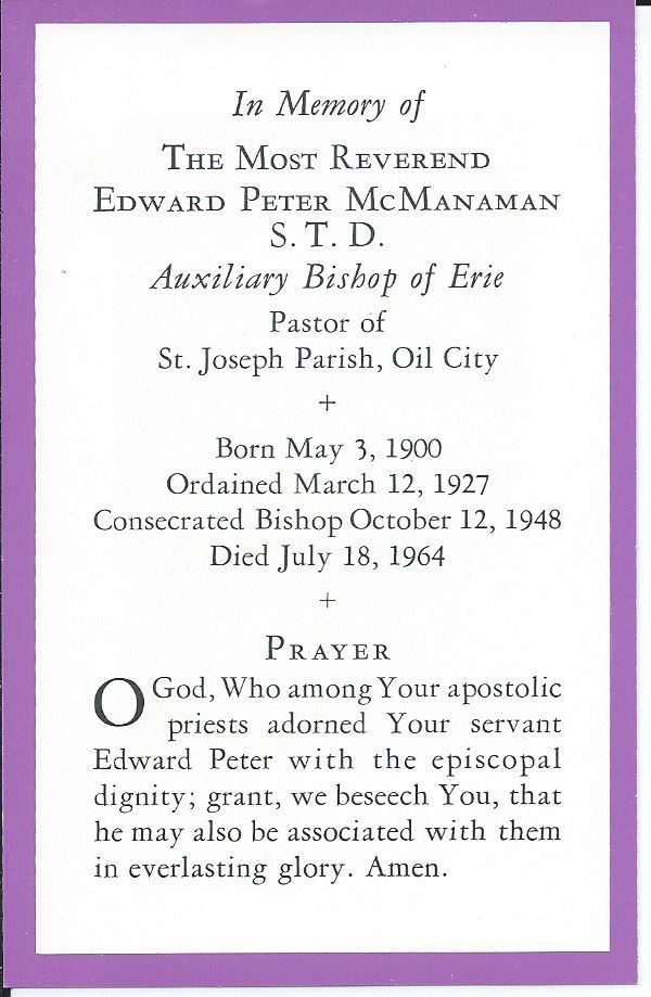 This was part of a book purchase (thank you eBay), and is a prayer card for the remembrance of the Most Reverend Edward Peter McManaman, STD, who was Auxiliary Bishop of Erie. Erie seems to have only had three auxiliary bishops in the last 100 years.